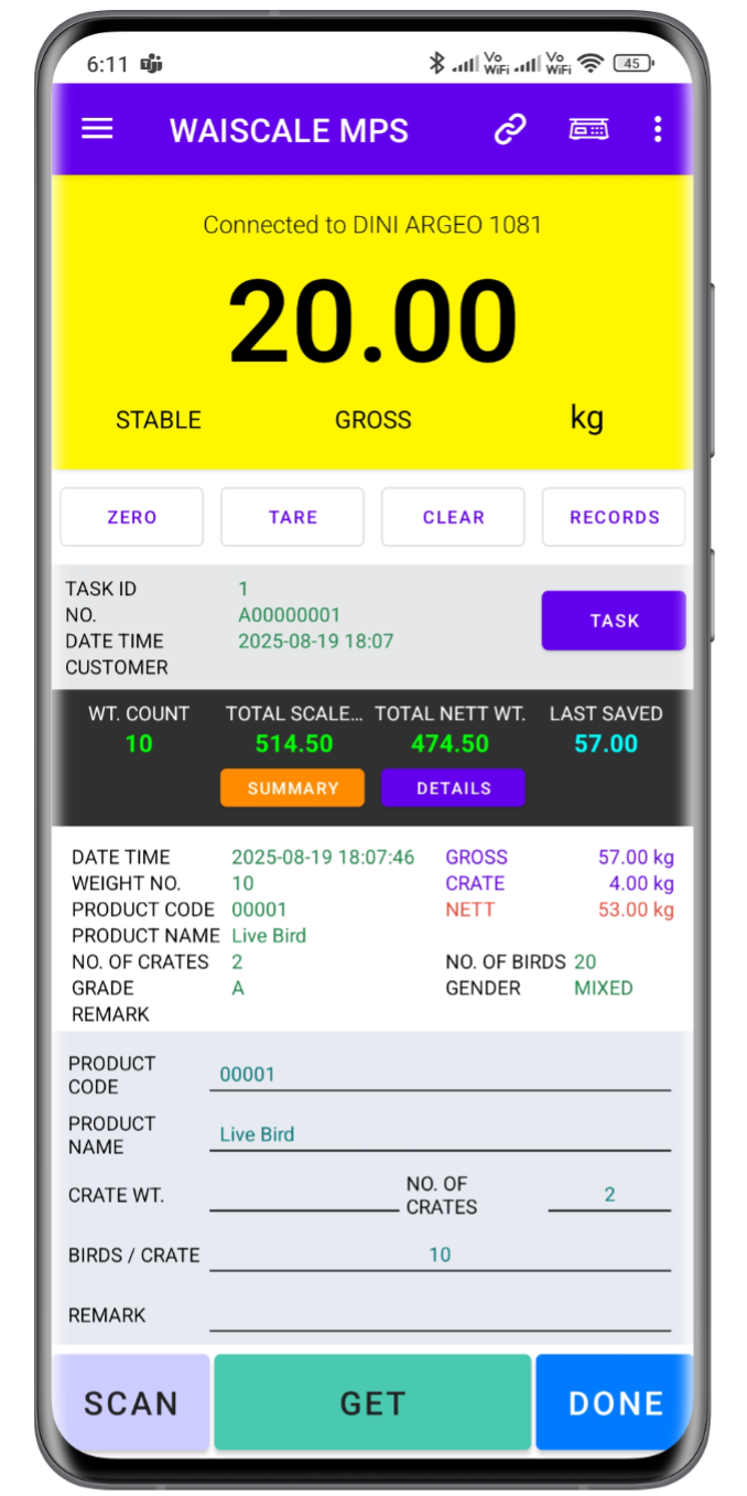 - Real time data reading from weighing scales